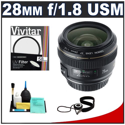 Canon EF 28mm f/1.8 USM Lens + UV Filter + Accessory Kit for EOS 30D, 40D, 50D, 5D Mark II, 7D, Rebel XS, XSi, XT, XTi, T1i Digital SLR Cameras for Sale - Review & Buy at Cheap Price